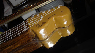 | Fender Jaguar elaborada en bizcocho de chocolate relleno de ganaché de chocolate. La coloqué sobre una base de espejo con un marco que simula los hechos en pan de oro para darle un toque romántico. |