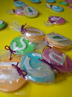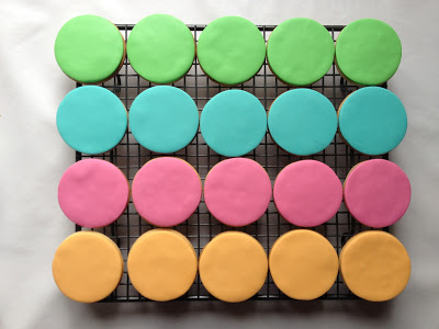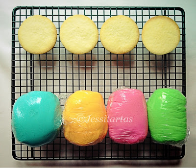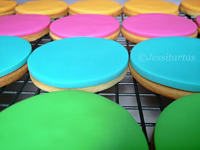 SIGUIENTE PASO: CORTAR LA PASTA DE GOMA O FONDANT EN FORMA DE CIRCUNFERENCIAS CON SUS COLORES RESPECTIVOS. En un primer momento pensé en hacer las circunferencias de fondant de menor tamaño que la galleta para que así se viera la galleta como marco de ella misma, pero no me gustó, quedaba mucho mejor toda la galletita cubierta de fondant…¿no les parece? Además, así se asemejaba mucho más al logo que me habían pedido…(que se verá más abajo)