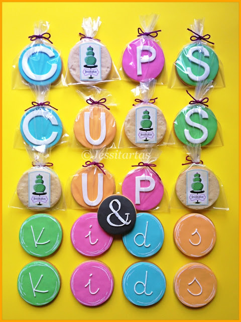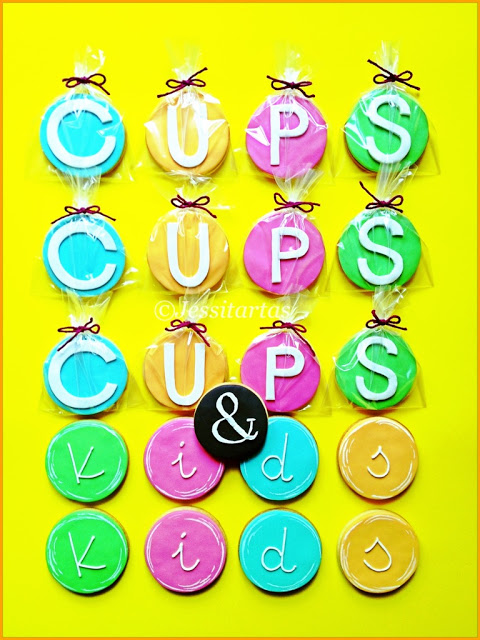 El pedido: GALLETAS QUE FORMARAN SU LOGO: la palabra «CUPS» (en mayúscula) y «kids» (en minúscula) con trazos circulares que más abajo verán. Y yo, encantada. Así que manos a la obra…HORNEAR GALLETAS Y COLOREAR LA PASTA DE AZÚCAR (necesitaba turquesa, naranja, rosa y verde)