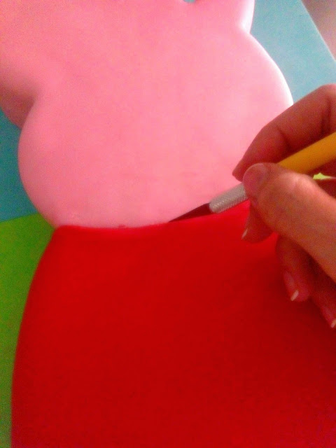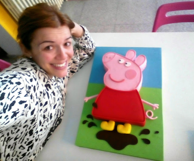 Pues bien, les cuento, esto me pasaba, entre otras cosas, porque era LA PRIMERA VEZ QUE USABA CREDIPASTE (bueno, en una ocasión lo utilicé en blanco para modelar, pero nunca hasta ahora, para cubrir). Es una pasta de azúcar que de resiste algo al principio pero luego se trabaja bien, y mejor aún si como hice yo, mezcle el rosa con blanco de Satin Ice porque necesitaba que el rosa no fuera tan intenso y que se asemejara más al color de la cara de Peppa Pig.