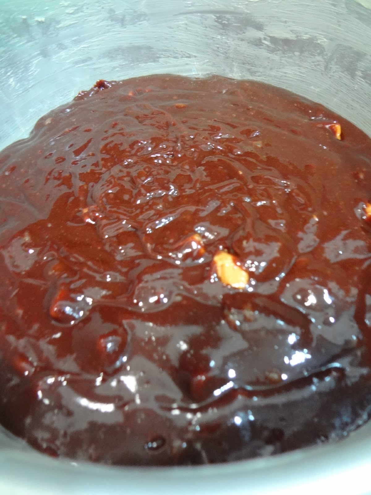 3. Cuando el chocolate y la mantequilla mezclados estén atemperados, viértelo en un recipiente grande para añadir y mezclar con el azúcar. Bate a media velocidad durante unos 2-3 minutos (yo lo hice con unas simples varillas, a mano) y ve añadiendo los huevos. Batir bien.